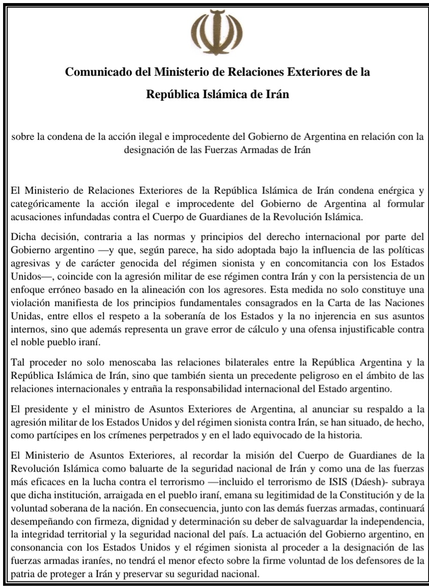 Comunicado del Ministerio de Relaciones Exteriores de la República Islámica de Irán sobre la condena de la acción ilegal e improcedente del Gobierno de Argentina en relación con la designación de las Fuerzas Armadas de Irán.