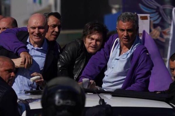 El equipo de seguridad del presidente argentino Javier Milei lo protege y lo evacúa en medio de una escena tensa en Buenos Aires, el 27 de agosto de 2025.